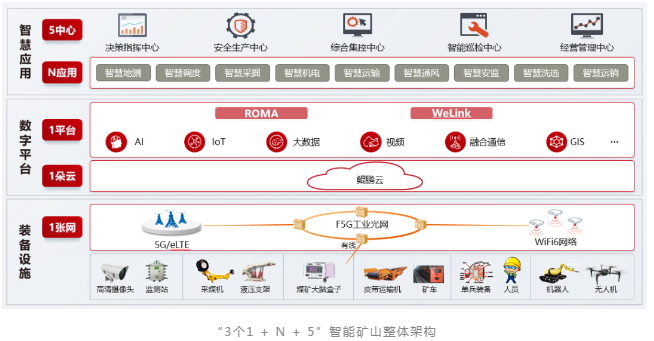 此次發(fā)布的華為智能礦山聯(lián)合解決方案,不僅引入了行業(yè)領先的5G、AI、鯤鵬云等新ICT技術,還融合了煤炭行業(yè)內(nèi)智能礦山建設豐富專業(yè)的實踐經(jīng)驗,形成了3個1 + N + 5的智能礦山整體架構(gòu),即礦山一張網(wǎng)、礦山一朵云、礦山一平臺、以及N個應用與5個中心。
